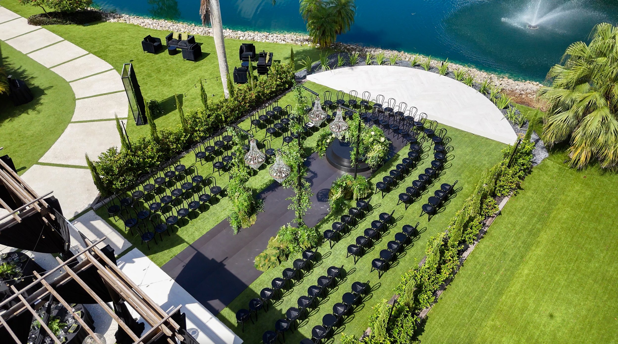 Gorgeous, raised ceremony stage against the backdrop of a tranquil pond and foundation – Our Circle of Love